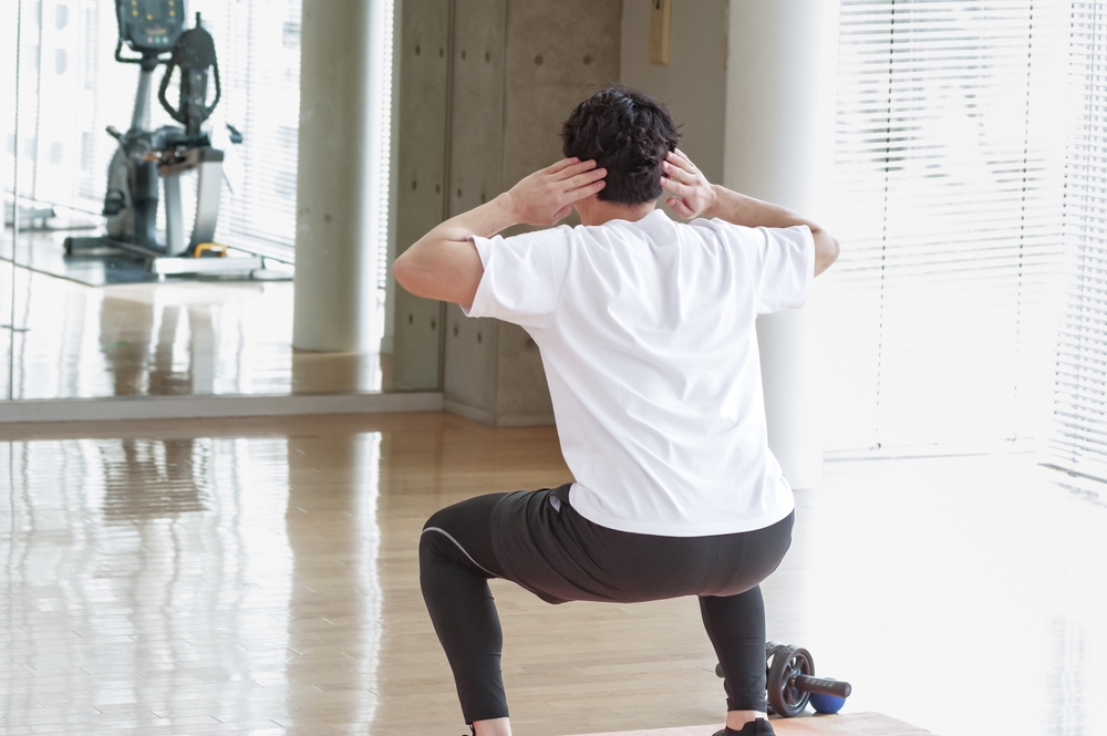 背中を曲げず、つま先よりも膝が前に出ないよう意識することがポイントです。10回を3セット行うことを目標にしましょう。下半身全体を鍛えることで基礎代謝が上がり、脂肪がつきにくい身体づくりにつながります。