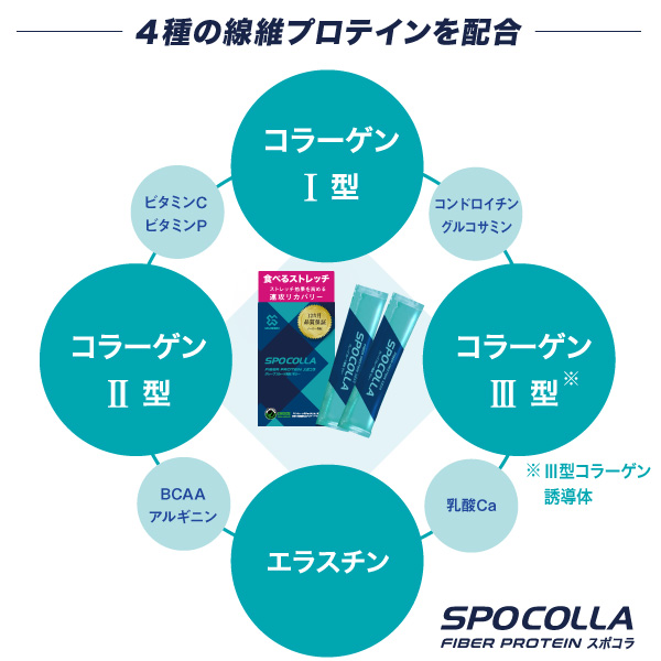 スポコラは、あらゆるスポーツの怪我に対応するために、4つの線維状たんぱく質と、それを活性化させる補助成分で構成されています。